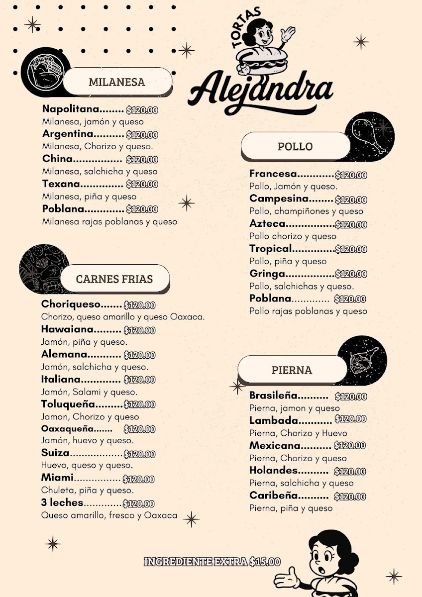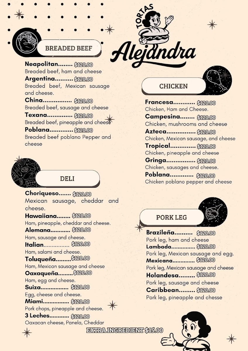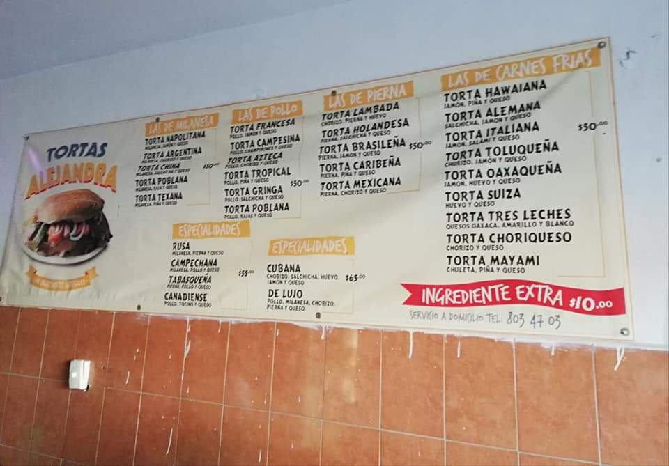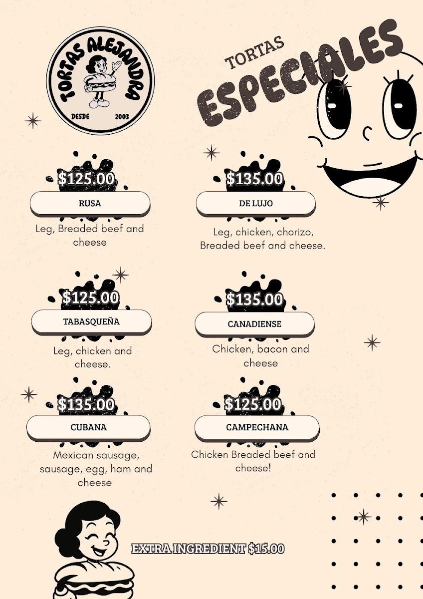 TORTAS ALEJANDRA is a gem in Playa del Carmen, offering authentic Mexican tortas that capture the heart of traditional flavors. Located on Av. Constituyentes, this spot stands out as a must-visit for both locals and travelers seeking a genuine culinary experience. The menu is simple yet satisfying, featuring tortas priced at MX$120, specialties at MX$135, and refreshing drinks for MX$60.